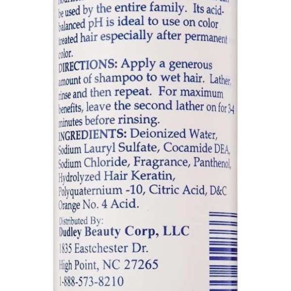 Dudley’s Deluxe Shampoo contains proteins and panthenol which add extra body, adds sheen and leaves the hair manageable. Dudley’s Deluxe Shampoo nourishes hair and is so mild that it can be used by the entire family. Its acid-balanced pH is ideal to use on color-treated hair especially after permanent color.