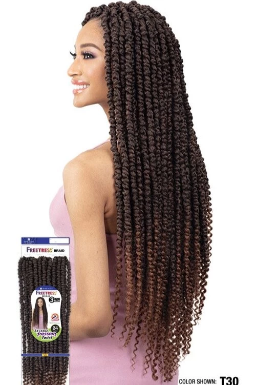 Freetress braid 3X Large Passion Twist 24″ is lightweight with great volume! Each strand is twisted tightly to prevent unraveling and finished off with curls to achieve a natural look!