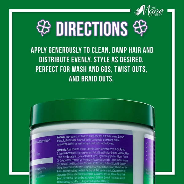 Directions: Apply generously to clean, damp hair and distribute evenly. Style as desired. Perfect for wash and gos, twist outs, and braid outs. For best results, apply the Hair Type 4 Leaf Clover Leave-In Spray prior to using the styling cream.