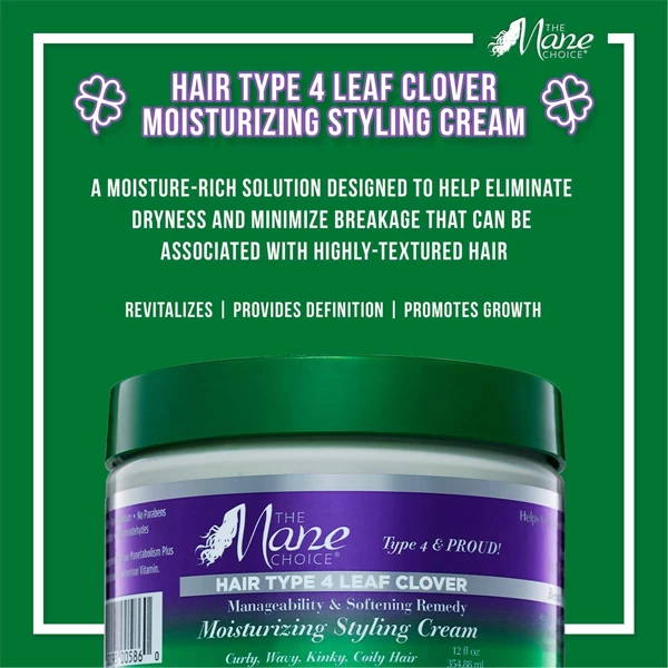 Hair Type 4 Leaf Clover Moisturizing Styling Cream provides nourishment, moisture, and soft, frizz-free control. Loaded with essential vitamins and nutrients to optimize your healthy hair care regimen.